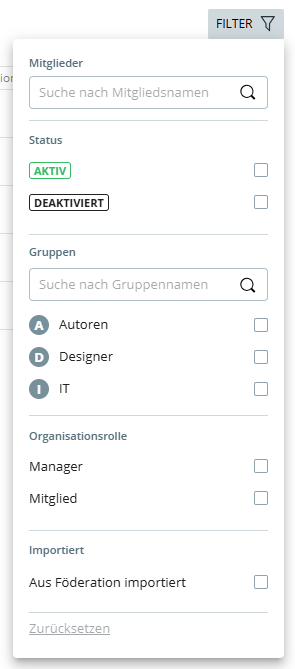 Wenn Sie ein Filterkriterium aus jedem Filter-Typ auswählen (z. B. „Status“ UND „Organisationsrolle“), werden nur Mitglieder als Ergebnisse angezeigt, die allen ausgewählten Kriterien entsprechen.
