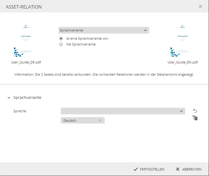 Abhängig von der Konfiguration Ihres CELUM Content-Servers kann es verschiedene Arten von Relationen mit unterschiedlichen Voraussetzungen für deren Erstellung geben. Standardmäßig ist nur der Relationstyp „Sprachvariante“ verfügbar und wird in diesem Artikel als exemplarischer Fall verwendet.
