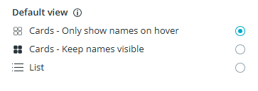 Cards - Only show names on hover: Card view with asset names only displayed when you hover your mouse over an asset cards.